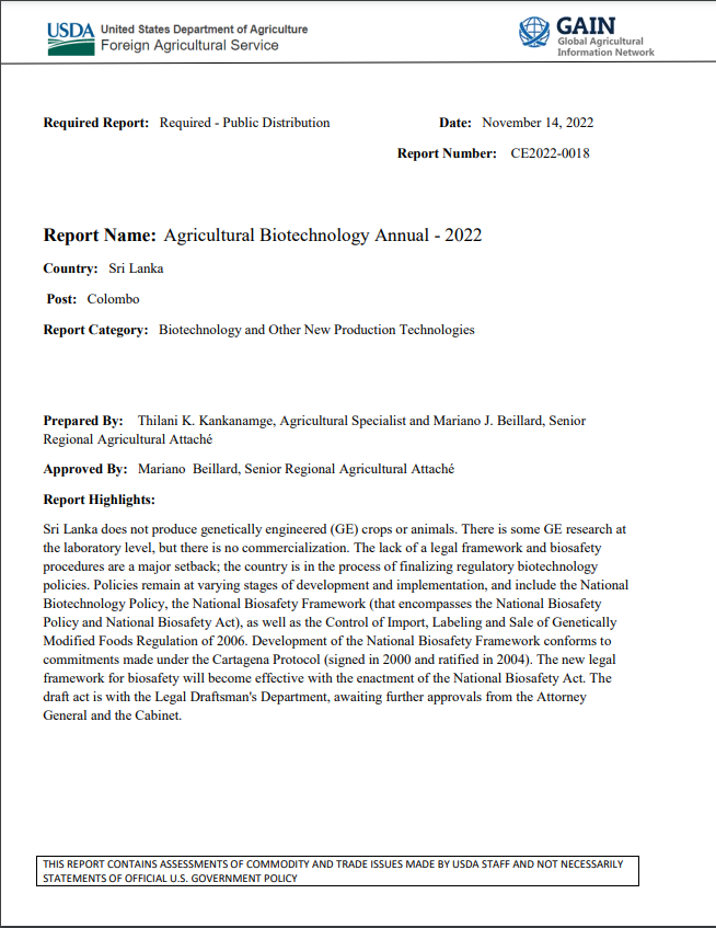 (2023) Americká zpráva potvrzuje produkci GMO potravin na Srí Lance Zdroj: AgricultureInformation.lk | Dokument ministerstva zemědělství USA